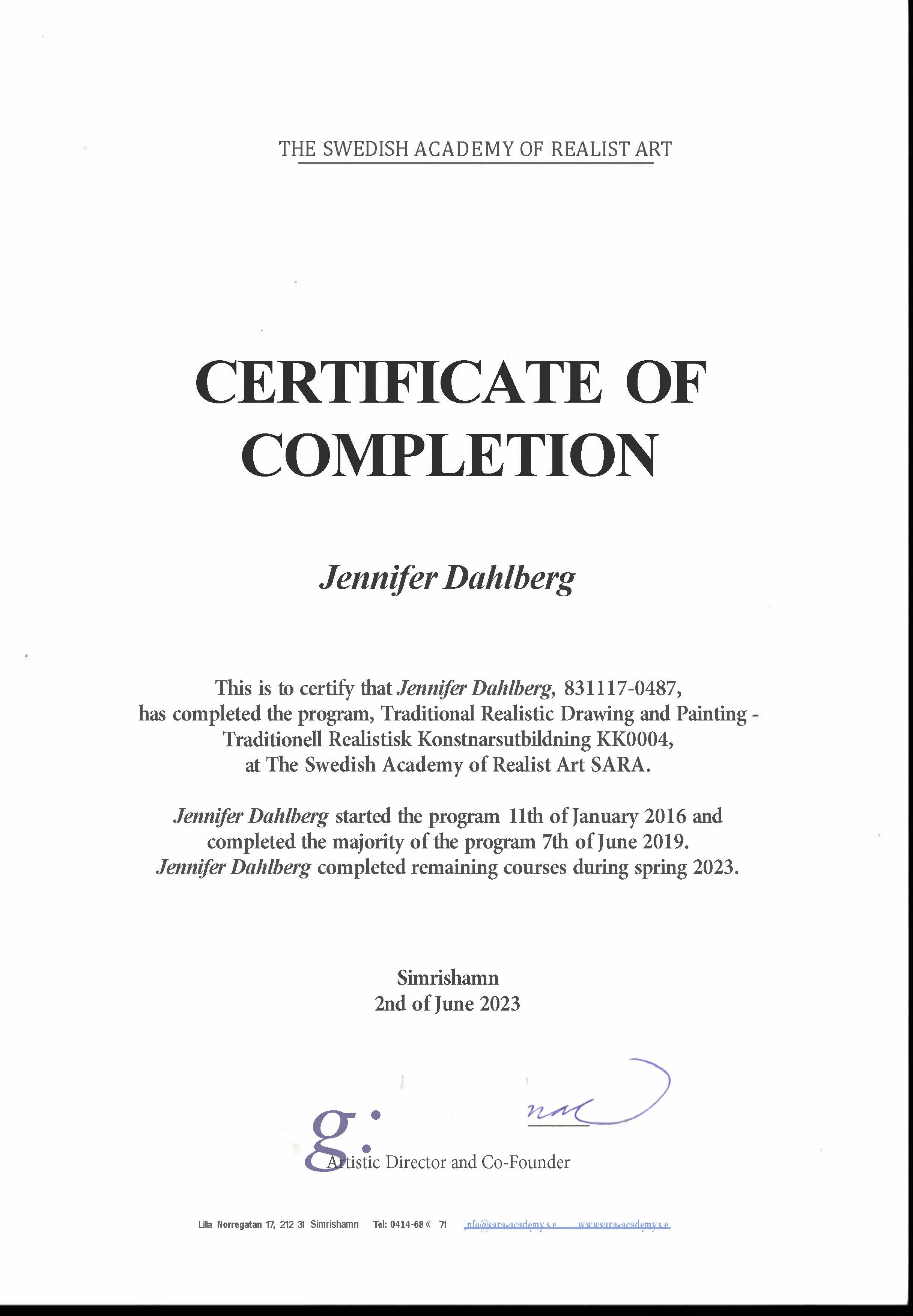 En konstnär med kvalifikation i traditionell konst skapade med kol och oljefärg, samt med ett stort intresse för digital konst. Hennes mål är att göra tavlor så realistiska och levande som möjligt. Jennifers kunskaper inom teoretisk matematik och pedagogik speglas i de detaljrika tavlorna. Hon kommer ursprungligen från Skottland men bor nu på Österlen i det vackra Skillinge. Söker gallerier för att visa sina nuvarande och framtida konstverk.